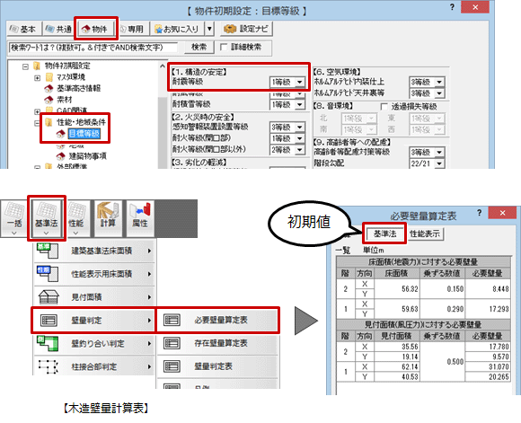 A:初期値を基準法モードにするには、「物件初期設定:性能・地域条件-目標等級」の【1.構造の安定】にある「耐震等級」を「1等級」に変更します。