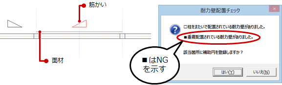 A:筋かいと面材といったように耐力壁を重複して入力されているときのエラーです。基本的には耐力壁の重複配置は行わず、「専用初期設定:凡例-耐力壁」で「筋かい+面材」の凡例を登録して、1つの耐力壁で入力してください。
