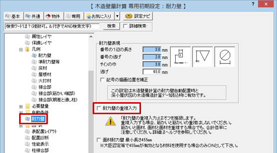 - 「専用初期設定:耐力壁」の「耐力壁の重複入力」をOFFにして、耐力壁を入力してください。