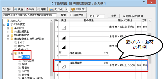 「専用初期設定:凡例-耐力壁」で凡例「筋かい+面材」が登録されていることを確認します。