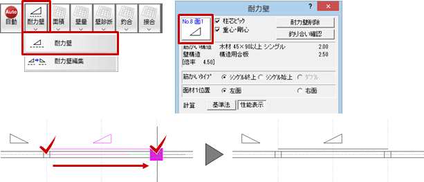 - 耐力壁の重複チェックは、「ツール」メニューの「耐力壁配置チェック」で行います。