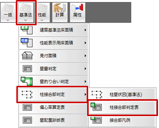 - 「基準法」メニューから「柱接合部判定」の「柱接合部判定表」を選びます。