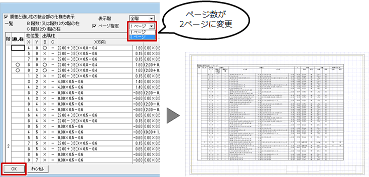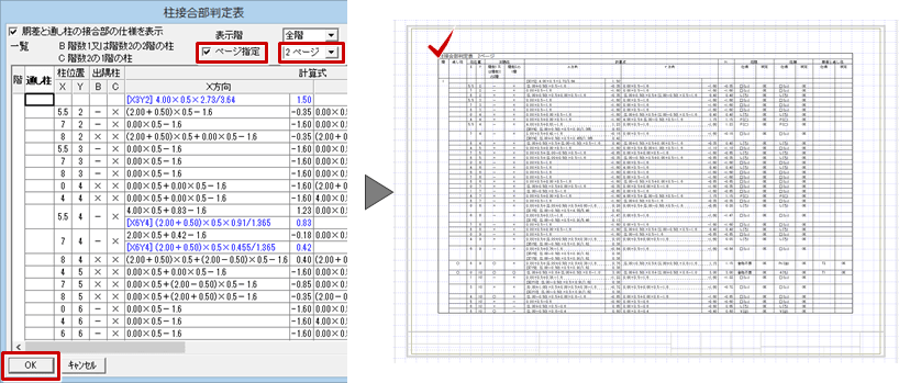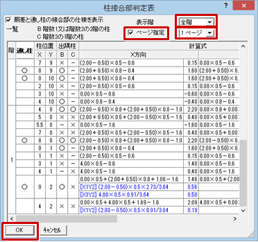 A:「柱接合部判定表」ダイアログの「ページ指定」をONにして、複数のページに分けて柱接合部判定表を配置します。