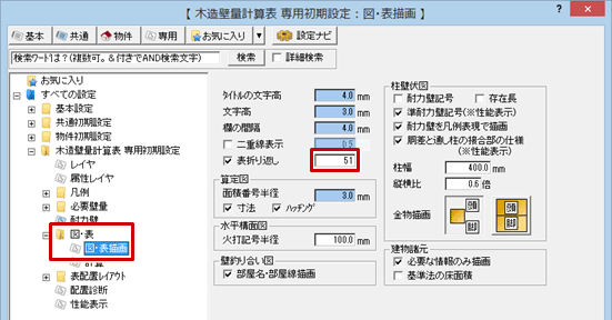- 「専用初期設定:図・表-図・表描画」の「表折り返し」を変更します。