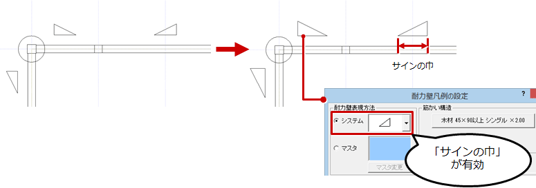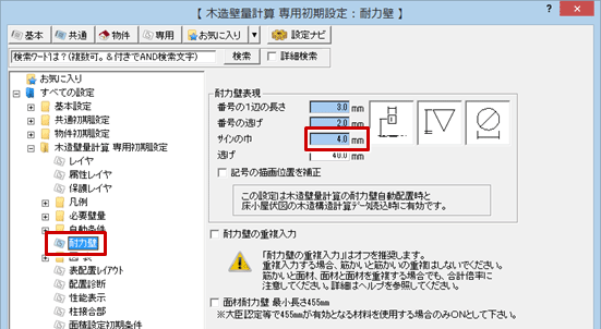 - 「専用初期設定:耐力壁」の「サインの巾」を変更します。