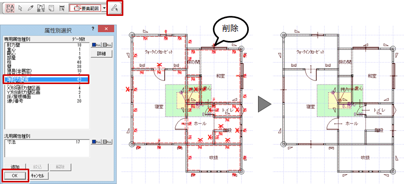 A:ツールバーの「属性別選択」を使って準耐力壁等だけを選択後、準耐力壁等を削除します。