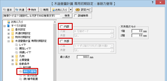 性能表示モードの「準耐力壁等自動配置」をクリックしても、準耐力壁等を自動配置しないようにするには、「専用初期設定:自動条件-準耐力壁等」の「内部」「外部」をOFFにします。