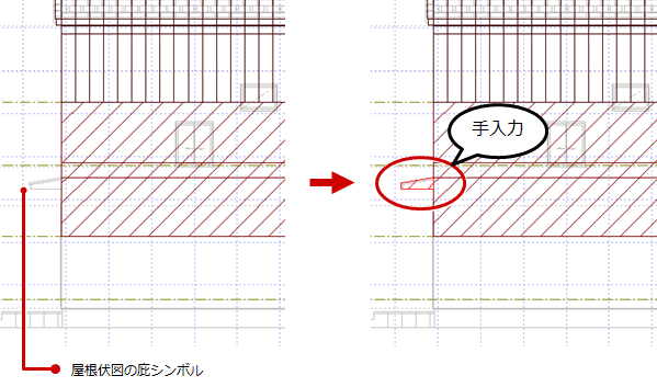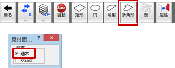 A:屋根伏図で入力された庇シンボルは、「見付面積自動」で見付面積が作成されません。「見付面積(多角円形)」などを使って庇部分の見付面積を追加します。