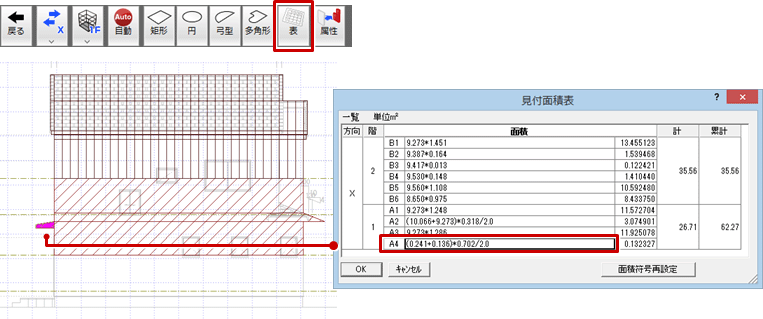 - 「見付面積確認」をクリックして、追加した見付面積を確認します。