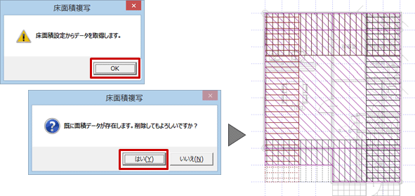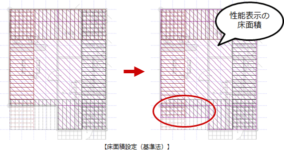- 性能表示の床面積設定側で「ツール」メニューの「床面積設定複写」を実行すると、基準法の床面積を複写できます。