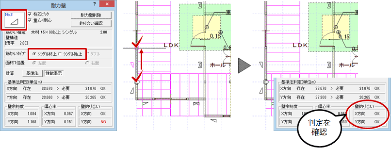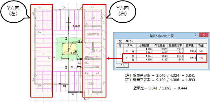 上図の場合、Y方向(左)の壁量充足率が小さく、壁率比が0.5未満であることを確認できるため、Y方向(左)に存在壁量を増やします。