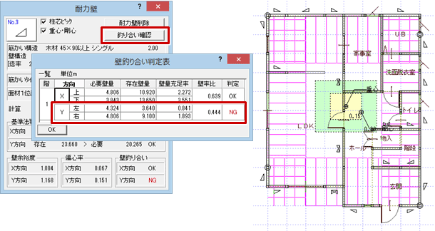 - 「耐力壁」ダイアログの「釣り合い確認」をクリックします。