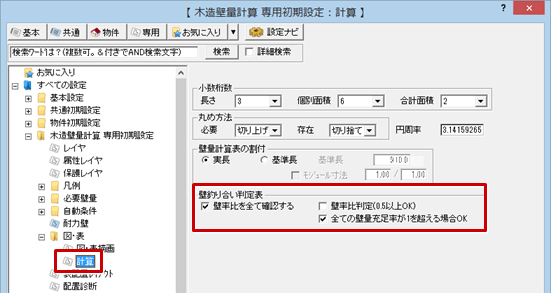「専用初期設定:図・表-計算」の「壁率比を全て確認する」「壁率比判定(0.5以上OK)」「全ての壁量充足率が1を超える場合OK」の設定によって、判定が「OK」となる条件が異なります。