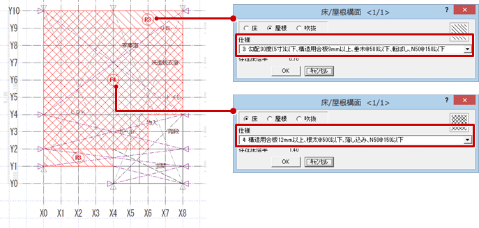 ※ 水平構面の凡例は、「専用初期設定:凡例-床材」「専用初期設定:凡例-屋根材」で登録します。