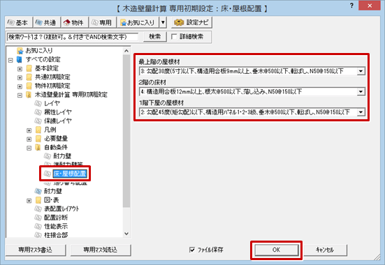 - 「専用初期設定:自動条件-床・屋根配置」で、自動配置時に使用する屋根材と床材を設定します。
