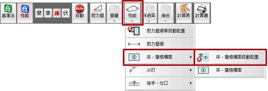 - 「性能」メニューから「床・屋根構面」の「床・屋根構面自動配置」を選びます。