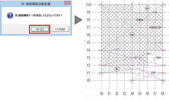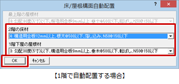 - 「床・屋根構面自動配置」ダイアログで、自動配置する仕様を確認して「OK」をクリックします。