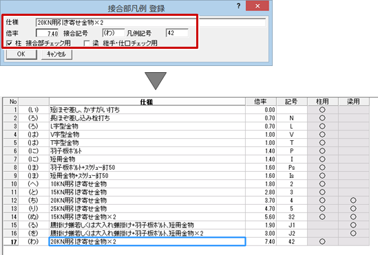 - 「接合部凡例 登録」ダイアログで仕様、倍率、記号などを登録します。