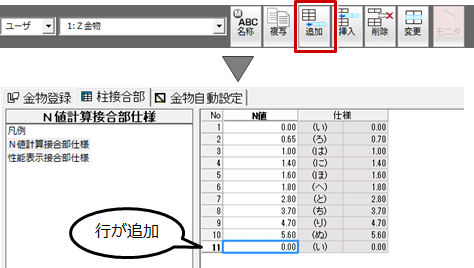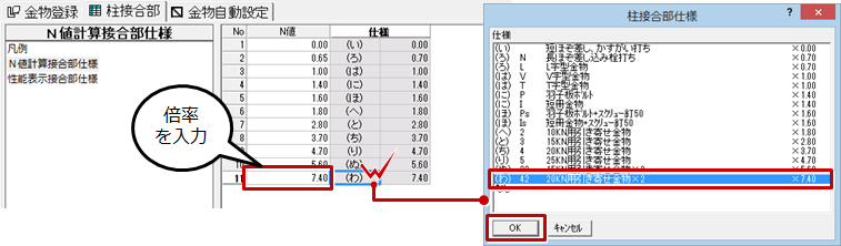 A:Z金物には5.6倍までしか登録されていません。N値が5.6を超えるような場合に5.6倍を超える接合部仕様で対応したいときは、金物マスタの「柱接合部」タブの「凡例」「N値計算接合部仕様」で仕様を登録します。