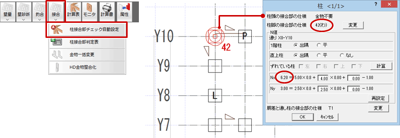 - 2階から「接合」メニューの「柱接合部チェック自動設定」で柱接合部を再設定します。