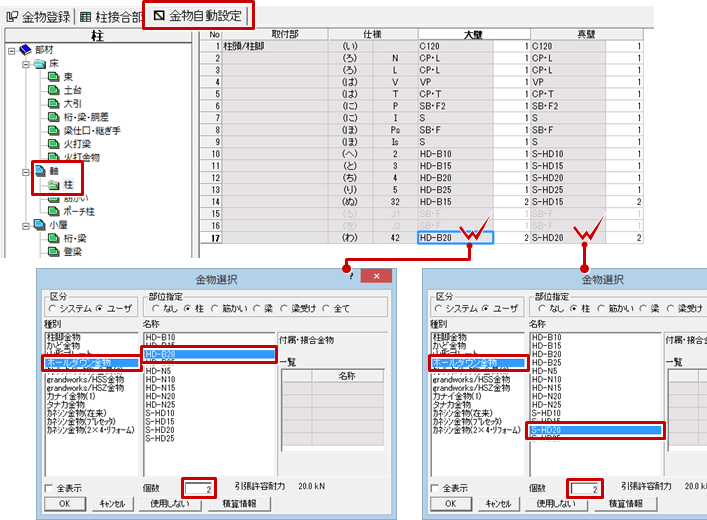 木造壁量計算の柱接合部仕様をもとに、木造基礎伏図にホールダウン用アンカーボルトを配置し、木造床小屋伏図の金物を自動設定するには、金物マスタの「金物自動設定」タブにて「柱」で金物を設定する必要があります。