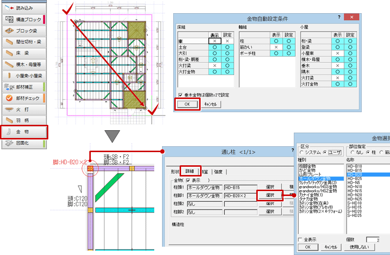 木造床小屋伏図で金物を自動設定するには、伏図アシスタントの「金物」を使用します。木造壁量計算の柱接合部仕様、金物マスタをもとに金物が自動設定されます。