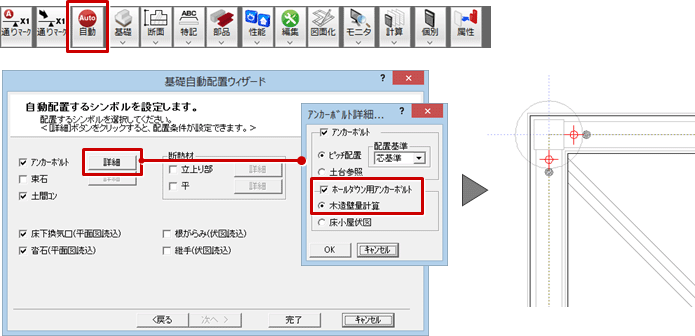 木造基礎伏図にホールダウン用アンカーボルトを配置するには、「基礎自動配置ウィザード」の「アンカーボルト詳細設定」ダイアログで「ホールダウン用アンカーボルト」の「木造壁量計算」をONにします。