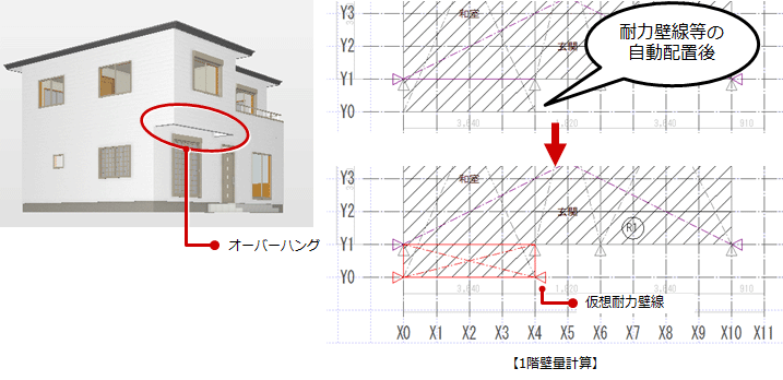 - オーバーハング部に仮想耐力壁線を入力します。