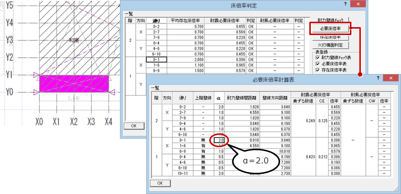 ※「床倍率判定」ダイアログの「必要床倍率」で、オーバーハング部がα=2.0であることを確認できます。