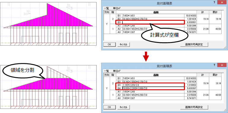 A:見付面積の形状が多角形になる場合は、計算式が表示されません。「変形」メニューの「分割」で、台形や三角形になるように面積区画を分割してください。