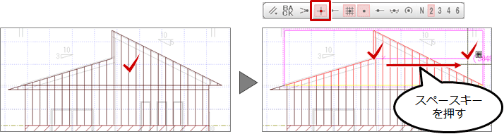 - 「ピック(交点)」をONにして、台形と三角形に分けられるポイントから水平方向(または垂直方向)に分割線を引きます。