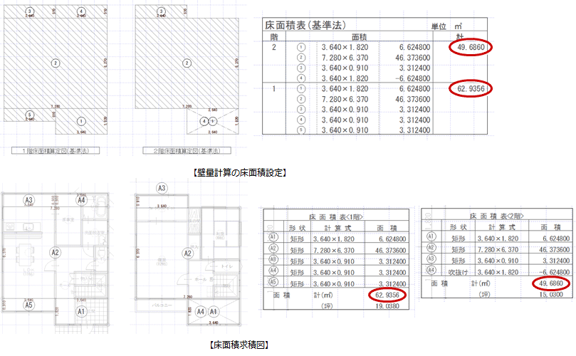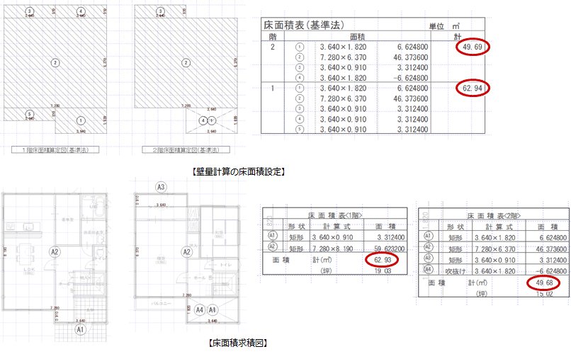 A:床面積求積図と壁量計算で、床面積区画の取り方と丸めの単位を同じにします。