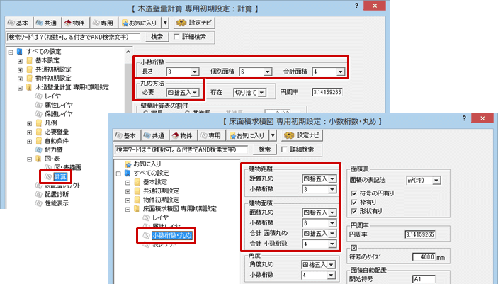 ・ 木造壁量計算の「専用初期設定:図・表-計算」の「小数桁数」と「丸め方法」の「必要」