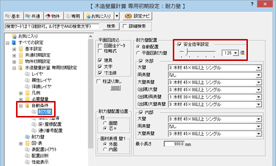 A:「専用初期設定:自動条件-耐力壁」の「安全倍率設定」で倍率を変更します。