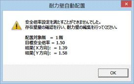 耐力壁の自動配置で、設定した安全倍率を満たすような壁量を確保できなかった場合は、次の確認画面が表示されます。