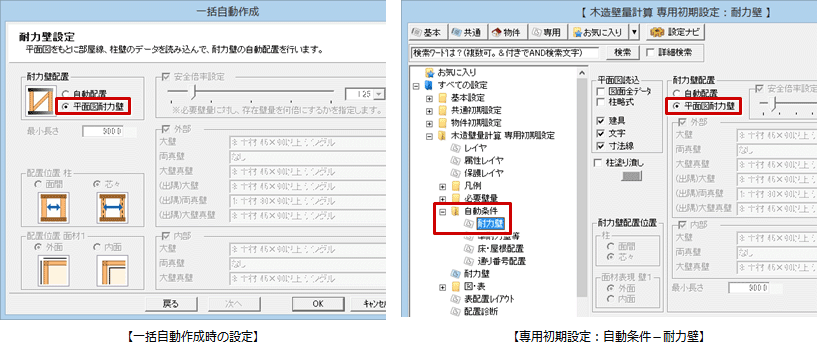 A:一括自動作成時の設定または「専用初期設定:自動条件-耐力壁」で、「耐力壁配置」を「平面図耐力壁」に切り替えて耐力壁を自動配置します。