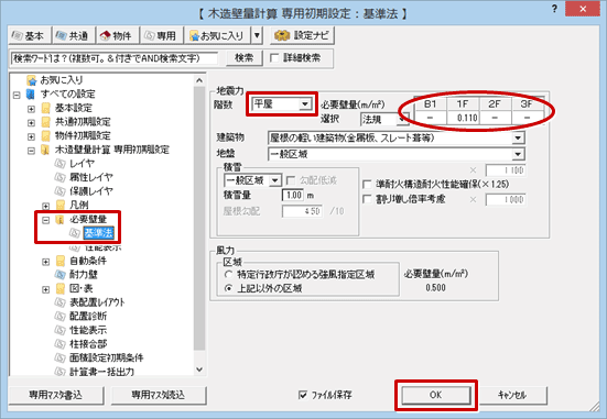 「専用初期設定:必要壁量-基準法」で、「地震力」の「階数」を「平屋」に変更して、「OK」をクリックします。