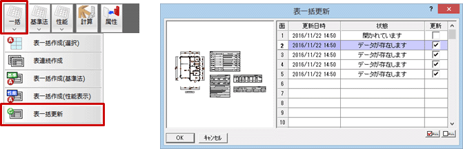 木造壁量計算表に図表を配置済みの場合は、「一括」メニューの「表一括更新」で更新します。