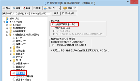 柱接合部の判定方法は、「専用初期設定:柱接合部」の「判定方法」で「性能表示解説書による」または「N値計算法による」から選択します。「接合」メニューの「柱接合部チェック自動設定」で柱脚・柱頭の接合部の仕様を自動設定するときに使用します。