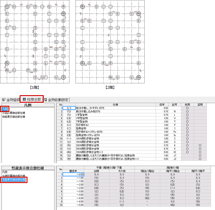 ただし、この補正が行われるのは、平屋建ての柱、2階建ての2階の柱、2階建ての1階の下屋部分の柱の場合です。2階建ての1階の柱に対しては行われません。 - 柱接合部の仕様は、金物マスタの「柱接合部」タブの「凡例」で設定します。