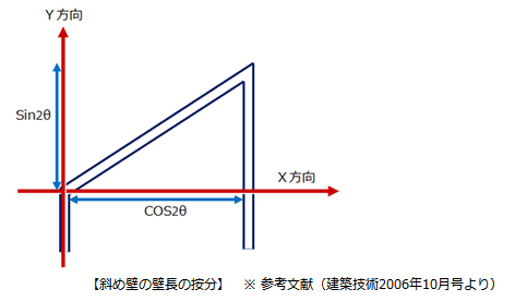 斜め壁の壁量は計算しています。下記計算式によってX方向とY方向に按分(モデル化)して壁量を計算しています。