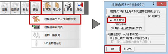 - 「柱接合部チェック自動設定」ダイアログの「原点指定」をONにして、「OK」をクリックします。