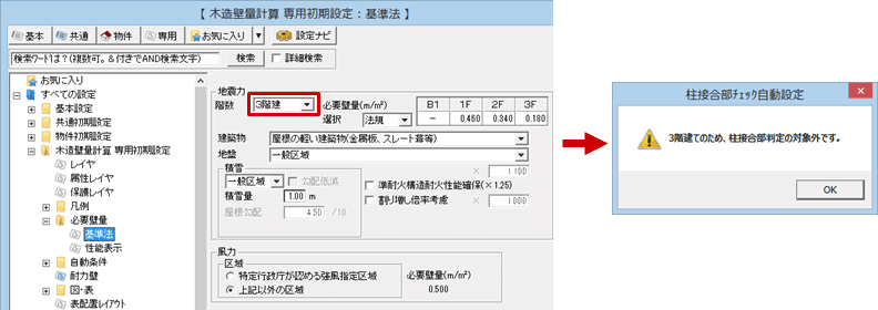- 「専用初期設定:必要壁量-基準法」で、「地震力」の「階数」を「2階建」に変更して、「OK」をクリックします。