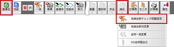 - 「基準法」をクリックして、「接合」メニューから「柱接合部チェック自動設定」を選びます。