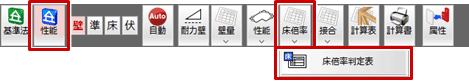 - 「性能」をクリックして、「床倍率」メニューから「床倍率判定表」を選びます。