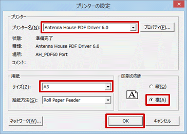 - 「プリンターの設定」ダイアログで、プリンター名から「Antenna House PDF Driver 6.0」を選びます。
