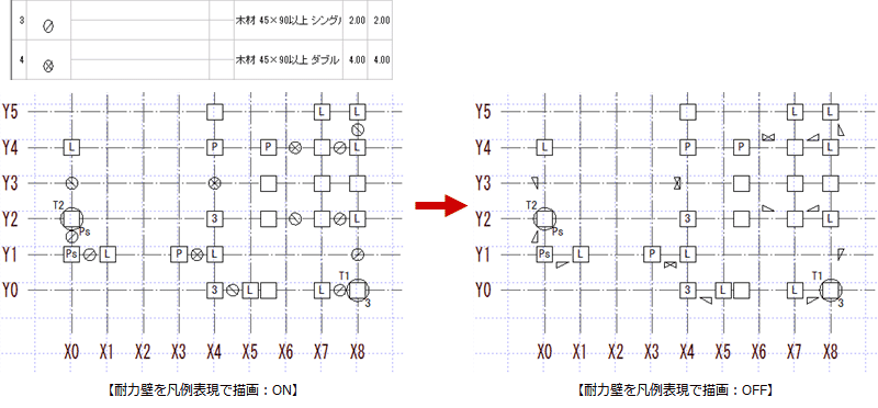 A:「専用初期設定:図・表-図・表描画」の「耐力壁を凡例表現で描画」をOFFにします。配置した柱壁伏図は「編集」メニューの「図形復元」で表記を変更します。