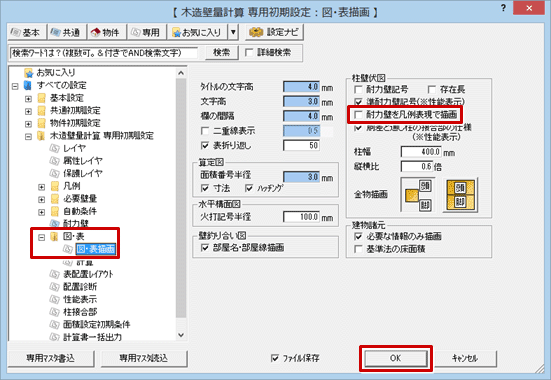 「専用初期設定:図・表-図・表描画」の「耐力壁を凡例表現で描画」をOFFにして、「OK」をクリックします。