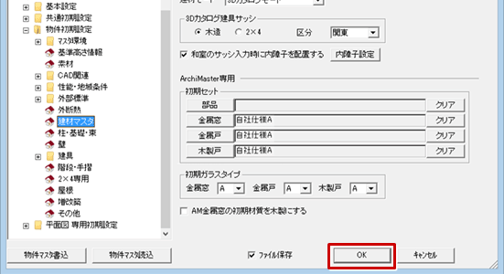 - 「物件初期設定:建材マスタ」の「初期セット」にある「金属窓」をクリックします。