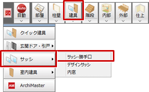 - 「建具」メニューから「サッシ」の「サッシ・勝手口」を選びます。
